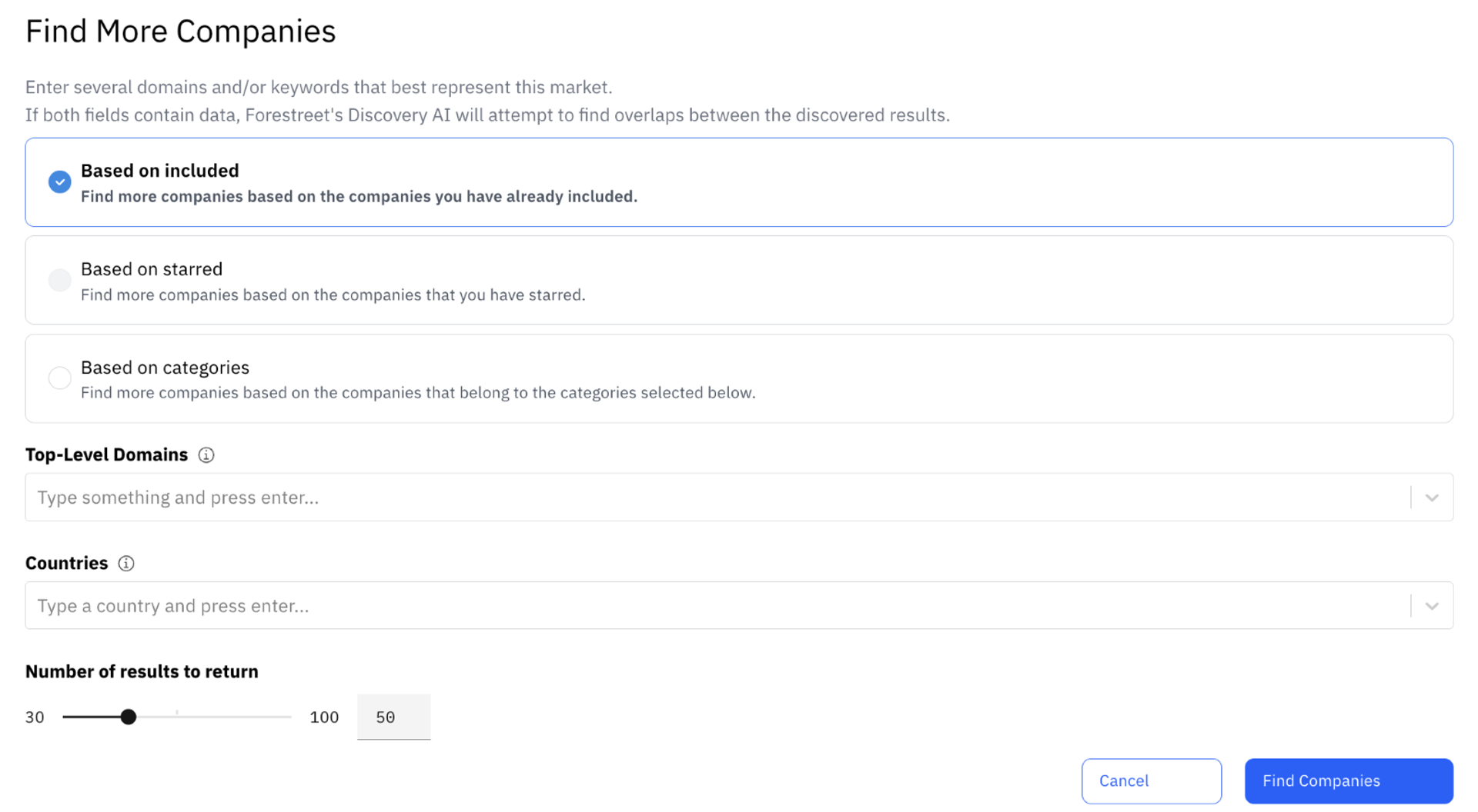 Forestreet Market Discovery is an iterative search process. Once you have reviewed all the companies on your list, you can find more.