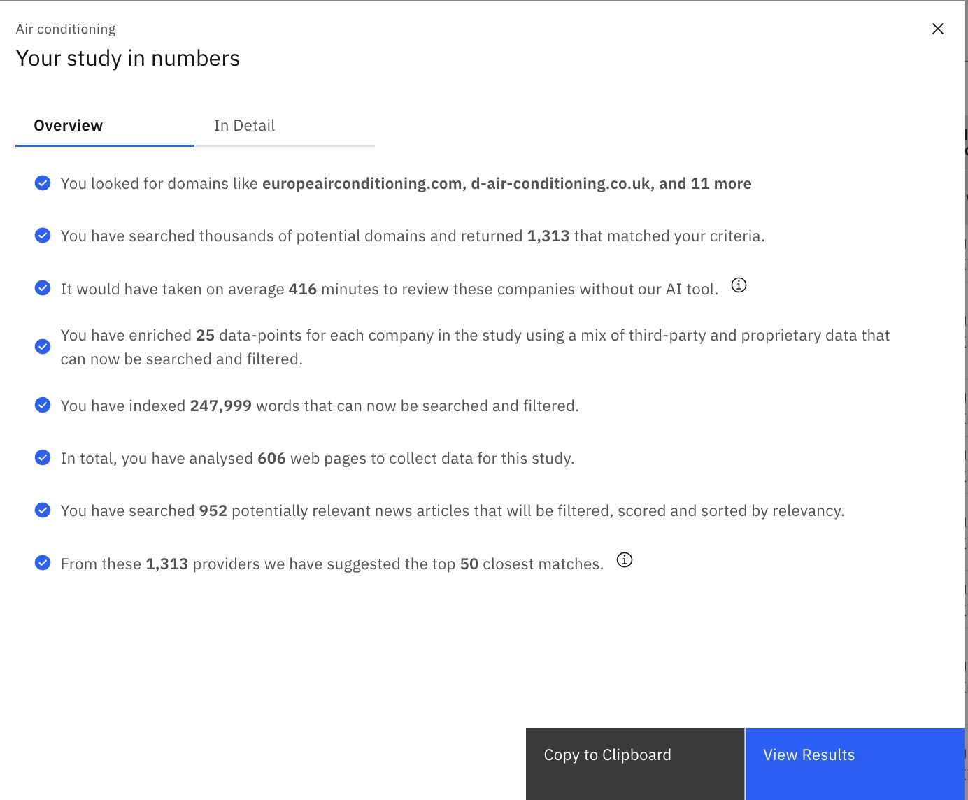 Here you can find a summary of your study, including the keywords and example companies you used, how many domains have been searched and the time it would have taken you to complete this search without Forestreet.
